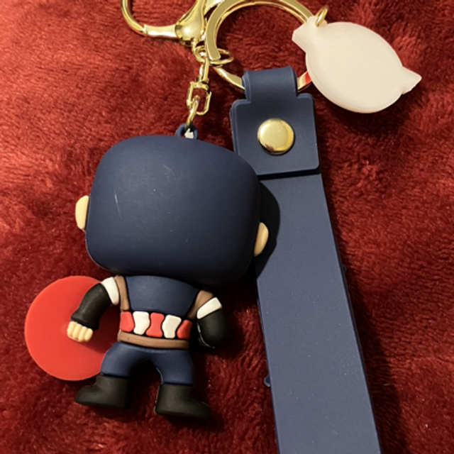This is a 3D Dark Blue Captain America cartoon made of rubber. It comes with a clip, a disk with Avengers sine on it and a hand band with Marvel on it.
