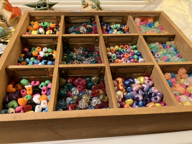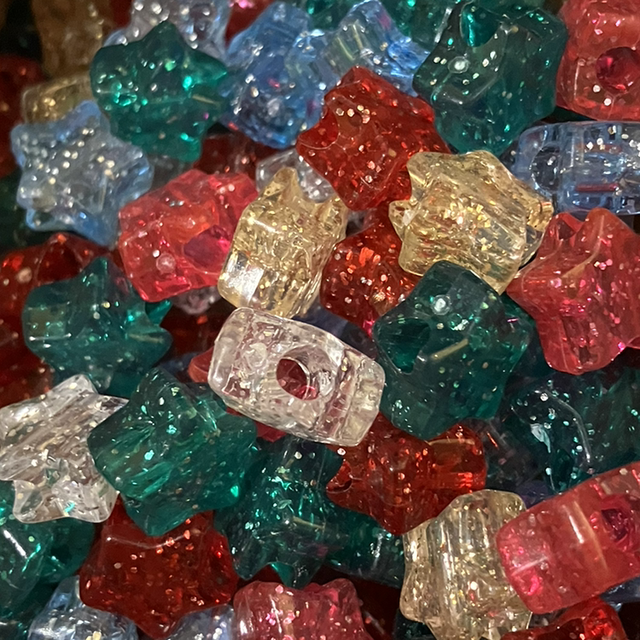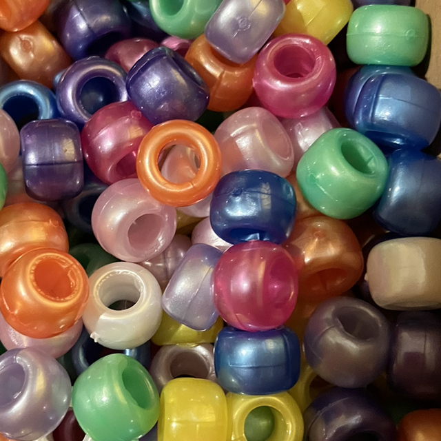 These plastic beads can be used for jewellery making. The beads have large holes.