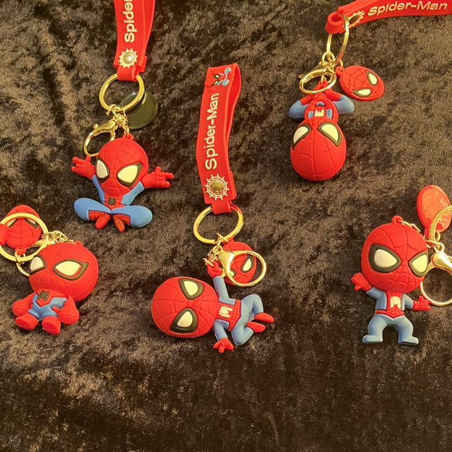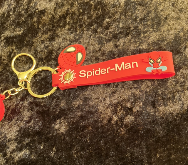 This is a 3D rubber Spider-Man. He is hanging upside down. He comes with a keyring, wrist strap and bag clip.